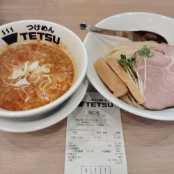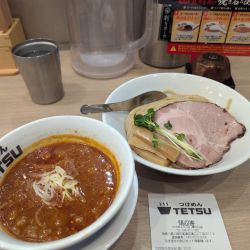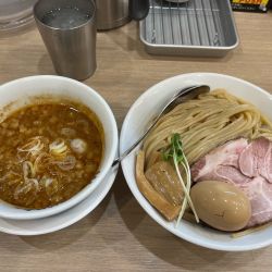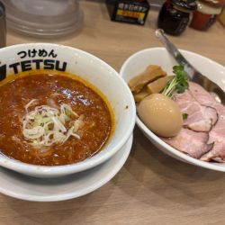 モチモチの極太ちぢれ麺に濃厚な味噌つけ汁が絡みます。