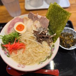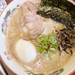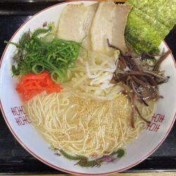 ほど良く茶濁した湯面、ワイルドな拳骨の風味。口当たりはあっさりで、熟成感のある香りと仄かな酸味から、長期間育てたスープである事が伺える。ソリッドな旨味に覚える逞しさ。醤油は福岡の物だろう、独特の甘口が走った。
