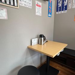 店内は白基調で明るい、今日現在下に棚のある厨房向きカウンター3席と4人掛けテーブル席が1卓、2人掛けテーブル席が2卓ありお水は出して頂きました (奥にお手洗いあり)。