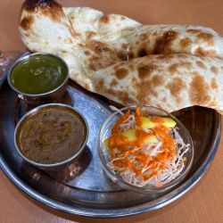ご夫婦でしょうか? にこやかに迎えてくれて2種類のカレーセットを「ほうれん草チキン」と「ダル(豆)」で中辛、ナン、ソフトドリンクはプレーンラッシーでお願い。