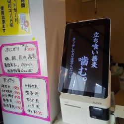 入口近くに食券機。推しの肉盛りつけ蕎麦が見つけられず、標題を選択。