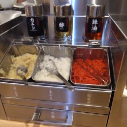 このお店は卓上アイテムが豊富なので自分で味変しながら楽しめるの~