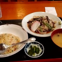 蕎麦屋の様ですが、屋外に掲示のランチメニューにはラーメン何種類か記載あり、炒飯あり。