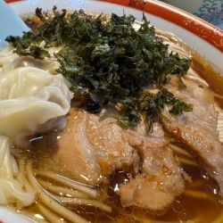 「ワンタンそば+肉増し」@麺屋 金花土の写真スープはやや濃い目なカエシと動物系出汁を感じるスープです。麺は菅野製麺所製の中太ストレート麺で、低加水の硬めの仕上がりでした。チャーシューは程よく味が染みていて美味しく、若い店主に期待を込めて採点しました。