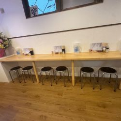半地下左側にある店内は白基調で明るい、今日現在壁向きカウンター8席と4人掛けテーブル席が2卓、2人掛けテーブル2席が卓あり氷入りお水とおしぼりは出して頂きました(奥右側にお手洗いあり)。