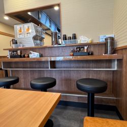 店内は和風で落ち着いた、今日現在下に棚のある厨房向きL字カウンター10席と4人掛けテーブル席が3卓ありお水は出卓上のピッチャーにてセルフ(奥突き当たりにお手洗いあり)。