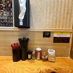 店内は木目調で落ち着いた、今日現在下に棚のある両壁向きカウンター8席.5席の計13席のみでお水は券売機左側の冷水機にてセルフ(奥左側にお手洗いあり)。
