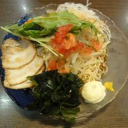 冷やし中華とセットの並チャーハンは、予想外にボリュームあるな、というビジュアル。食べ進むとわりとしっかりと固められておりほぐれるとさらに量が増えたように感じます。どちらかというとしっとりタイプ、具材はネギ、玉子、チャーシューで油分はそこまで強くなくて塩分もよい塩梅でした。冷やし中華のボリュームが控えめなので両方完食して程よい満腹感となりました。