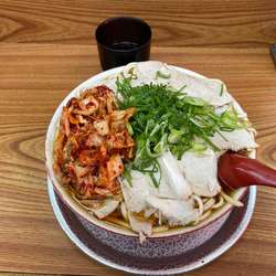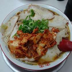(土)ちょうど昼、20人以上の列に接続してすぐに注文〜着丼までは約50分。キムチは想像以上に辛くて本格的、そして大量。ヤワ麺好きにはたまらない、唯一無二のチャーシュー麺、美味い。テント、提灯の破れ具合、暖簾の褪せ具合もイイ感じ、通いたくなる要素満載。