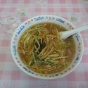 豚肉の細切り、モヤシ、ニラ等の餡かけがのった醤油ラーメン。