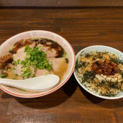 牛骨黒ラーメン(並)700円、チャーシュー増量200円、ラー油めし200円。合計1100円。まー油がニンニクベースでとても香ばしくスープがとても美味しいです。細ストレート麺が柔め。チャーシュー10枚。もやし、ネギ。