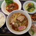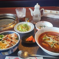 ラーメンはコクのあるスープにさほど絡まない中細プリプリ麺、辛口を謳うほどではなくピリ辛な感じ。モヤシ以外にニラ、ネギで韓国っぽくなくスタミナ風です。
