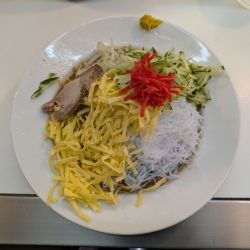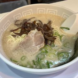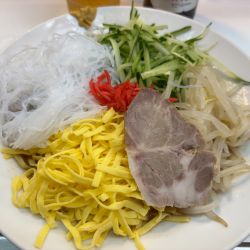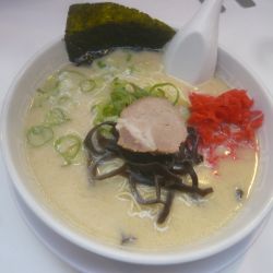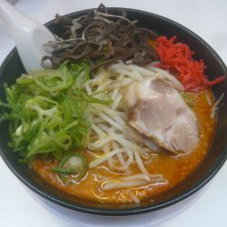 麺は緑色でクロレラ入りの縮れ平打ち麺。