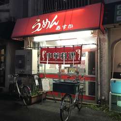 | 備考 | 店内メニューには店名「明日香」と表記。 <<<<<<< 2010/04 時点主な麺メニュー >>>>>>> ラーメン¥500 五目ソバ¥600 チャンポンメン¥600 味噌ラーメン¥600 天津メン¥600 タンメン¥650 マーボーラーメン¥650 カレーラーメン¥700 カレーチャンポンメン¥700 ピリ辛味噌チャンポン¥700 チャーシューメン¥800 味噌チャーシューメン¥850 辛醤麺(ラージャーメン)¥700 肉糸絲湯麺(ユースータンメン)(肉細切ラーメン)¥800 蝦仁湯麺(シャーレーンタンメン)(エビ塩ラーメン)¥800 ヤキソバ¥500 ソースヤキソバ¥550 冷麺¥650 ギョーザ¥200 麺大盛り+¥150 他定食、中華メニュー豊富に有り |