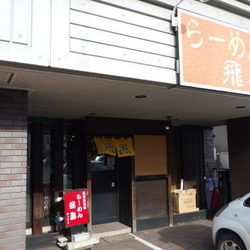 ・店の外観:赤っぽい看板、黄色い暖簾。