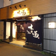 ・店の外観:板張りの看板、藍色の暖簾・垂れ幕
