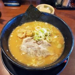 看板メニューの『豚こく醤油ラーメン』プラストッピングで、チャーシュー、バター、温玉を注文。