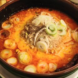 すりゴマとネギがたっぷり乗っています。好き嫌いあるかもしれませんが、私は良い組み合わせだと思います。少しまったりとしたスープにネギの刺激がアクセントになります(バランス的にはネギが強すぎな気はしますが)。