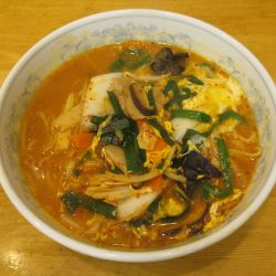 ピリ辛の1段上程度のまあまあ辛いスープ。たれは醤油だけでなく味噌も少量合わせていそうな趣の味わい。コクはそれなりにあり、辛味と玉子の甘みとのコントラストはいい感じ。油脂感は低い。