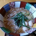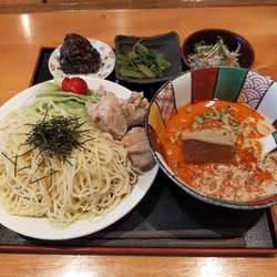 赤い香味油が浮いたつけ麺は唐揚げがのっているなど一風変わっています。つけ汁は胡麻の風味がするもので担々麺風の仕上がりです。つけ汁はポン酢を凍らせた氷が浮いていてとても冷えています。つけ汁は冷えていますが胡麻などの風味がきいていて旨味もありなかなかです。辛味は無し、辛口、激辛の3種類から選択でき辛口にしましたがピリ辛で良いアクセントになっ... 続きを見る