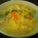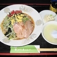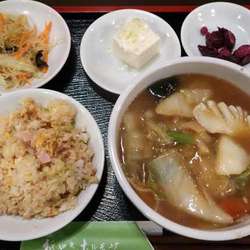 頼んだのは、ランチのハーフ・ハーフ880円。ご飯と麺が3種づつ位から選べるのですが、半チャーハンと広東麺にしました。ビーフンのサラダ、冷奴、漬物も付きます。