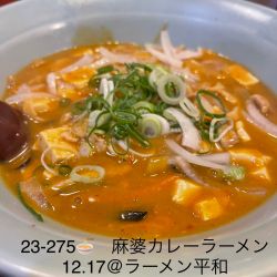 嫁さんがお気に入りのラーメン屋さん。麻婆カレーラーメン、辛さは調節出来るみたいだけどそのままで頂きました。細麺でカレー味もいい感じで後で残らない感じ。具も沢山入ってて美味しゅうございました^ ^