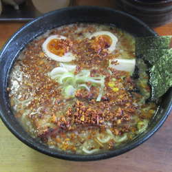 スープは、薄めの豚骨醤油で、一面にフライドガーリックが載っています。