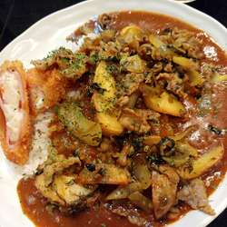 天満「カルダモン」の「カレーライス」、野菜とフルーツの甘味と酸味を感じるサッパリしたカレー。お昼時は行列でき人気です。