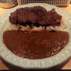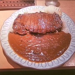薄くはあるが一枚のステーキが載せられた見た目豪華なカレー。