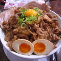 超濃厚中華そばの感じが残ってて、濃厚なスープは豚骨だけ魚介ナシに断面長方の麺に青ねぎ、粗微塵切り玉ねぎ、ナルト、それらと並んで肉が肉肉と載ってます。