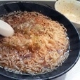 澄んだ醤油ベースの鶏がらスープ。細い縮れ麺。