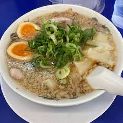 ワンタンメンを一味抜きで,それに味玉を注文して待つことしばし。登場したのは背脂が浮かぶ一杯です。