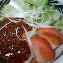 ピリッとした刺激の肉味噌餡にシャキシャキレタスに白髪ネギ、キュウリにトマト。