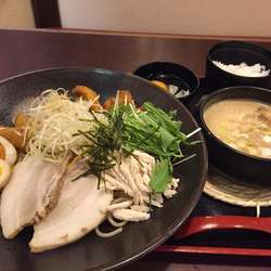 クリーミーに泡だてされて、鶏白湯らしいマイルドな味付け。太いつけ麺とも、よく絡みダブルでしたが、美味しく頂きました。ご飯と生卵を入れ、ちょっと加熱するはずが、コンロが故障していたのか、温められず、ぬる雑炊だったのが残念。