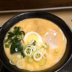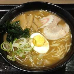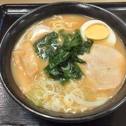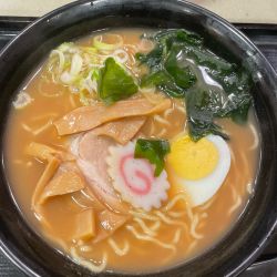 具は、なると・わかめ・ネギ・メンマ・チャーシュー・玉子半身。ネギがおそらくはうどん・そば用と同じもので、ザクザクの荒切り。ラーメンには少々ミスマッチな印象。