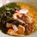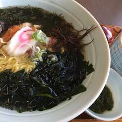 磯ラーメンを口頭注文。窓からの海の素晴らしい景色を眺めながら待つと直ぐに熱々の丼が配膳される。