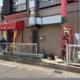 普通の2階建てのベージュ色壁の戸建ての1階、赤い看板、赤地のテント看板、のれん。