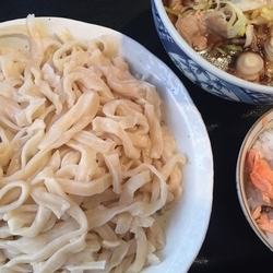 食べ応えのある太麺のつけうどん。食の進むあげやネギの入ったつけ汁も良かったです。鮭ご飯のサービスも嬉しい一品。