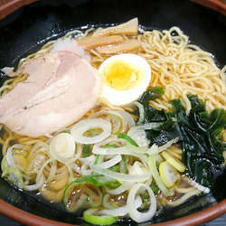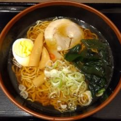 3分程で出来上がる。トッピングはしっかりしたメンマ、ちゃんとしたロールっぽいチャーシュー、半ゆで卵、いつものワカメに刻みネギ、ナルト。かなりしっかりしたトッピングに少し驚く。