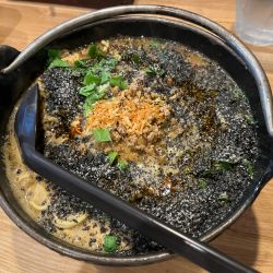 黒胡麻坦々麺は、鉄鍋に入って提供