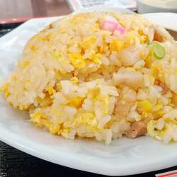 チャーハンは、玉子、刻みチャーシュー、ネギの入ったシンプルなしっとり系。通常の一人前かは分からないけど半チャーハンのレペルではないボリューム。