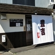 ・店の外観:建物は板張り屋根と白い壁、白い垂れ幕。