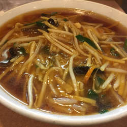 スープは飲みきれないほど多めです。醤油スープをベースに熱々の野菜たっぷりあんかけが入っています。