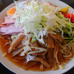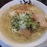 青竹を使って手打ちした中太縮れ麺に豚、鶏、野菜をベースとした音楽かけて醤油風味のスープが絡む。具材はナルト、ネギ、チャーシューといたってシンプル。