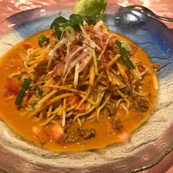 「トマト入り坦々冷麺」@獅門酒楼の写真予想外に美味しい。中華街の冷たい麺の中でもかなり美味しいです。坦々のたれもコク辛み旨味ととトマトの酸味のバランスがとてもいい。他の具材は肉味噌と紫玉ねぎと青ネギ。シンプルだけど満足度高い麺
