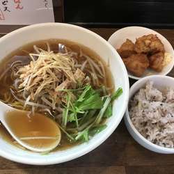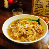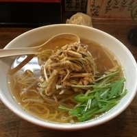 デフォでブラックペッパーのきいたオーソドックスな鶏ガラ醤油スープ。鶏肉とネギに合えられているゴマ油と生姜が混じり味変していく。