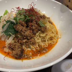 汁無し坦々麺は見た目もよく、辛味だけでなく甘味も感じられる。麺はやや細めの縮れ麺を持ち上げぐちゃぐちゃに混ぜ食す。