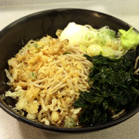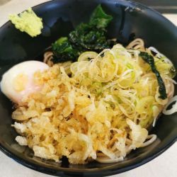 たぬきそばですが、わかめに温泉たまごもあります。