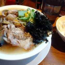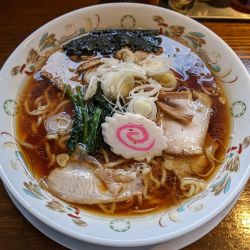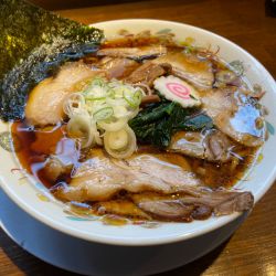 中濃豚骨煮干しベース塩味、とんこつの味はしない。煮干し塩味。嫌な臭みはない。大量背脂。中太縮れ麺がよい食感。4〜5枚バラ、玉葱短冊がよいアクセント