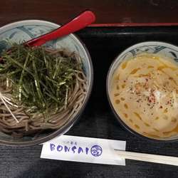 | 備考 | 「つけめん」と「蕎麦」の融合、新感覚の「つけ蕎麦」です。 カツオ、サバ、昆布等の厳選素材で丁寧に出汁をとり、鶏油や山椒でまとめたつけ汁は天然素材にこだわった無添加です。 ツヤとコシのあるこだわりの黒蕎麦をつけてお召し上がり下さい。 【其の一】オリジナル調合の鰹・鯖・宗田等の節をたっぷり使用。 【其の二】使用する返し(タレ)は、試行錯誤の末辿り着いた独特のレシピ。使用するまでに1週間程ねかせます。 【其の三】蕎麦はそば殻を混ぜ込み、スープに負けないよう改良した黒くて太い特注の日本蕎麦です。 【其の四】大量の鶏皮から取る純度100%の鶏油、数種類の天然スパイスを煎ってから砕いて混ぜた特製スパイス等の調味料。 【其の五】野菜は新鮮な国産のものを使用し、全て店内手作業で仕込みます。 |